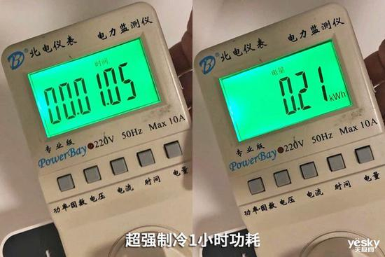 超强制冷、制热模式虽然效率高速度快,但相对的也会比较耗电,我们也测试了两种工作模式下空调的耗电量。如下图所示,超强制冷1小时5分钟,测得耗电0.21度,相比后面我们进行的普通制冷模式,这一耗电数据要高了约1.8倍。