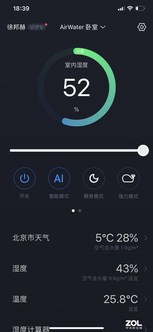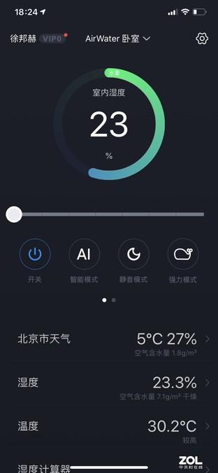 靠着自然环境,在供暖季达到30%湿度是很难的,为此我们也做了一些场景测试。在依靠中央空调取暖的办公室,湿度在28%左右浮动;在依靠暖气供暖的卧室,湿度在23-25%之间;如果暖气供暖不足,当开启电暖气或者空调辅热后,湿度直线下降至20%以下。。。