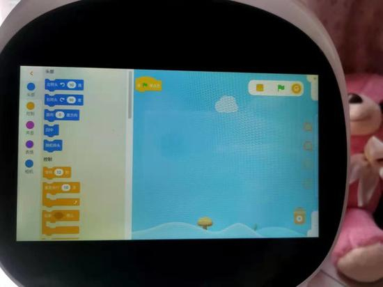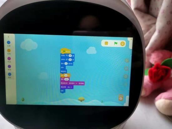 阿尔法蛋大蛋2.0还开发了丰富的创意编程模块,可以培养孩子的逻辑思维能力与动手能力,手指拖动左侧边栏指令,随意组合,点动小绿旗帜开始编程,阿尔法蛋大蛋2.0就会自动服从你的指令执行动作啦!