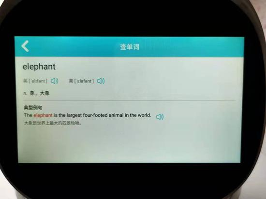 指尖查词功能不仅可以解决孩子对于课本必须掌握的单词识读问题,课外延伸阅读时遇到不认识的字词也可以请教阿尔法蛋大蛋2.0。打开“指尖查词”程序,把手指指向不认识的汉字或单词,阿尔法蛋大蛋2.0会立刻认出,并在屏幕上显示读音释义、笔顺组词,英文单词还会显示例句和英美发音。 当然啦,也可以在唤醒大蛋2.0后,直接指着某个字或者词询问意思。