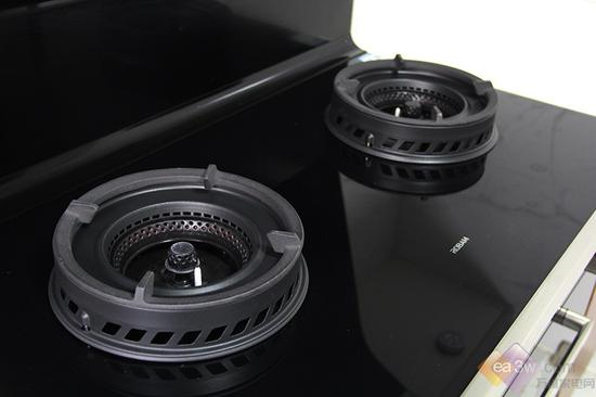 再来看看灶具部分。老板集成油烟机一个很大的亮点是,将灶具的操作旋钮与下方蒸箱/消毒柜的操作区集成到了一起,不但美观简约,也极大地便利了烹饪过后的清洁工作,平整的炉台一擦到底。