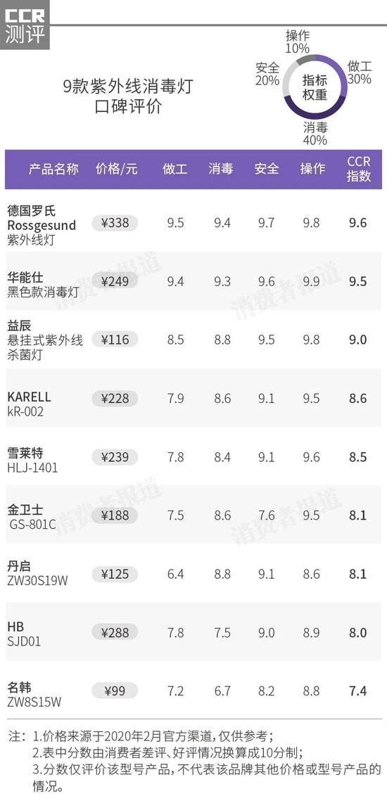 2020年2月,《消费者报道》汇总了京东、天猫、苏宁上热销的9款紫外线消毒灯的评价情况,对约1.3万条消费者评价数据进行了分析和评分。