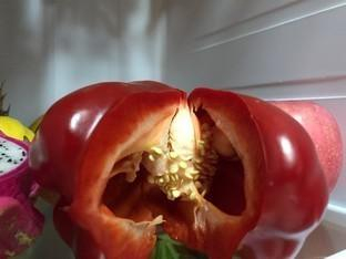 同样经过3天储藏,用于测试彩椒边缘有些打蔫,可以看到彩椒的籽没有明显脱水现象,整体捏起来水分很足。足以证明,这款风冷冰箱在确保大风量制冷的同时,依旧能提供出色的湿度。