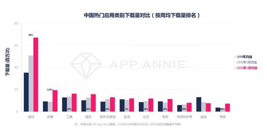 在国内游戏市场,情况亦相似。据移动数据分析公司AppAnnie统计,中国iOS市场2月前两周的周下载量平均值超2亿次,比2019年全年的周平均值要多出40%。而通常情况下,春节之后游戏下载量是会出现急剧下降的。整个2月,游戏类软件的下载次数排名最高,是教育、工具、娱乐和照片视频之上。