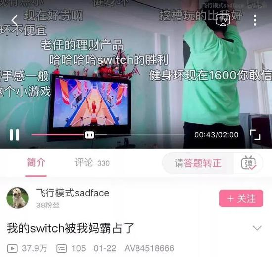 有网友录下了自己妈妈玩《健身环大冒险》的视频,弹幕里都是哈哈哈哈。人们七嘴八舌地吐槽着“理财产品”的天价,一面惊呼“阿姨玩得比我还好”。而视频作者,只打下一句简短的标题——我的Switch被我妈霸占了。不满的语气下,是对趣味宅家生活的暗暗炫耀。