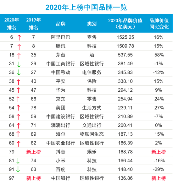 阿里巴巴的品牌价值增长了16%至1525亿美元,较去年排名上升一位至全球第6名,是中国最有价值的品牌。腾讯(+15%,第7名,1510亿美元)也上升一位至第7名。抖音(国外品牌为TikTok)首次上榜,以169亿美元的品牌价值排名第79名,是今年五个新晋品牌中排名最高的。