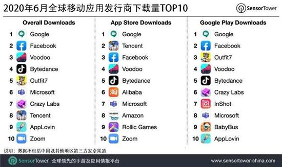 在Sensor Tower发布的6月移动应用发行商下载排行榜单上,Voodoo甚至以综合排名第三的成绩力压腾讯(第八)。
