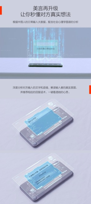 二是依托于中国人的日常输入大数据,配合社会心理学图谱的分析,美言魔屏还将识别对方信息的真实意图并推荐相应的回复话术。自古女人心都像海底针,常常把男生搞得晕头转向,美言魔屏将彻底打破这一怪圈,让你看破女友的真实想法!