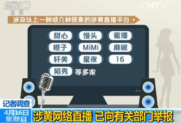 记者调查发现,“涉黄直播平台”的内容主要有:裸露身体、色情表演、兜售色情视频与图片等,涉及以上一种或几种现象的涉黄直播平台包括:甜心、馒头、蜜播、橙子、MiMi、麻椒、轩美、星夜、16、陌秀等多家。
