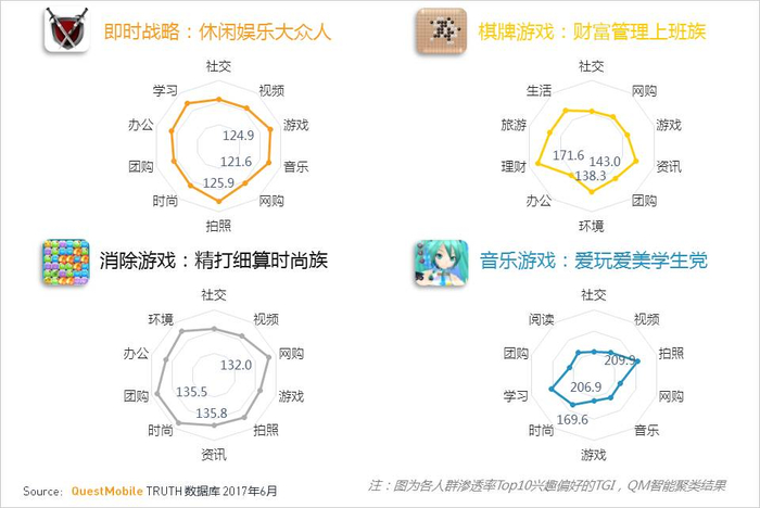音乐游戏人群则明显偏好拍照、学习和时尚应用(其中拍照应用偏好甚至略高于学习类应用),是爱玩爱美的学生党。