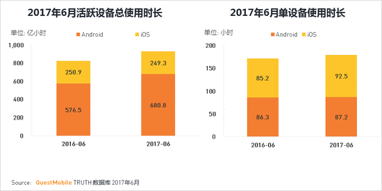 ·活跃设备总使用时长已达930亿小时,随着安卓活跃终端总量的增长,安卓设备总时长同比增长18%。·从设备时长来看均有不同程度的增长,iOS单设备月度使用时长为92.5小时,同比增长8.6%。