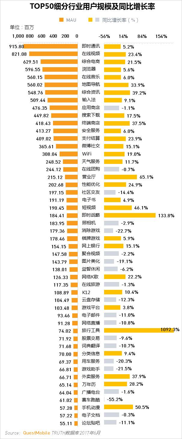 2017年6月同比增长较快的热门行业有:即时战略133.8%(王者荣耀);短视频46.1%,终端商店37.5%,地图导航33.9%;旅行工具1092.3%(共享单车)。