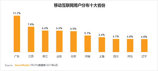 移动互联网用户分布的地区集中在经济较发达及人口更多的省份和直辖市,广东,江苏及浙江省最多。