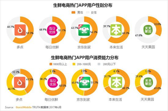 ·热门生鲜电商APP的用户消费能力普遍较强,线上消费1000元以上的占比基本都超过综合电商APP。