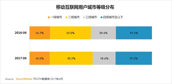 从移动互联网用户城市等级分布看,二线城市占比最高,且与去年同期相比增长最快。