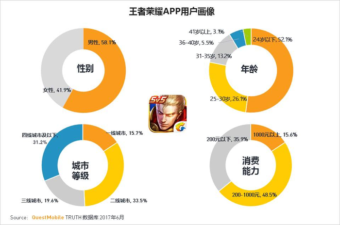 ·王者荣耀的男性用户占比58%,且24岁以下年轻用户占比超过一半。