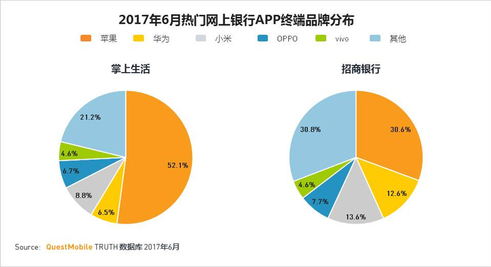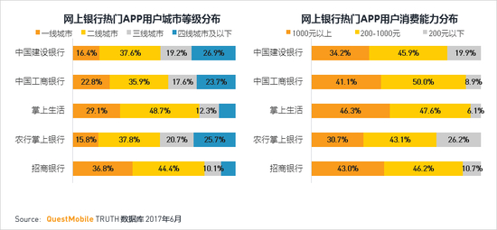 ·招商银行和掌上生活APP在一线城市的分布最高,其线上消费能力也是最高,体现了其高端用户多的特点。