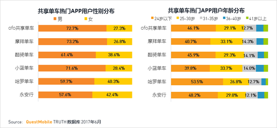 ·从共享单车行业整体看,男女比例在7:3,除酷骑单车、哈罗单车、永安行的女性比例显著偏高外,其余共享单车APP用户的男女分布都与行业数据持平。