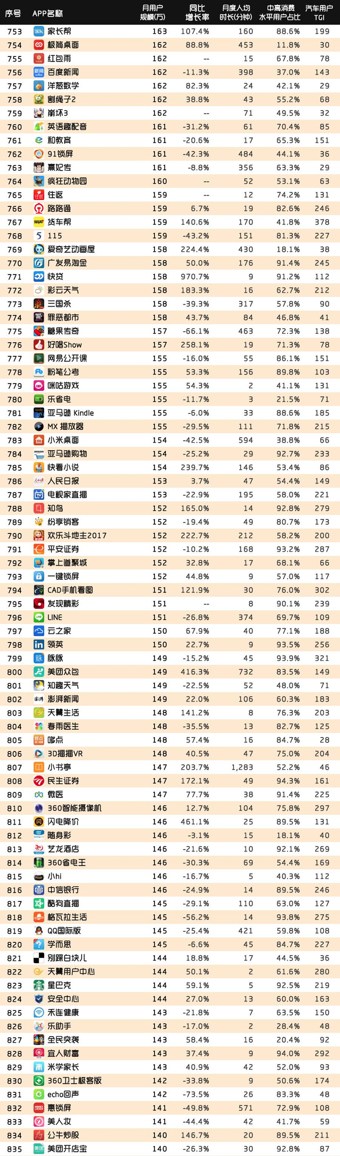 移动社交(包括微信)行业月度总时长遥遥领先;新闻资讯行业总时长同比增长率最高;其次共享单车的火爆而带动了旅游出行整体行业总时长的增长;
