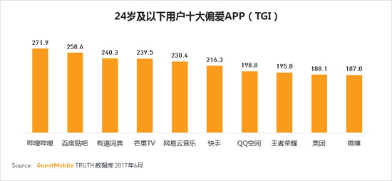 ·24岁及以下年轻用户偏爱的十大APP分别是:哔哩哔哩,百度贴吧,有道词典,芒果TV,网易云音乐,快手,QQ空间,王者荣耀,美团,微博。
