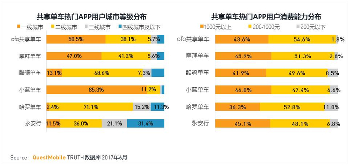 ·共享单车用户主要分布在一二线城市中;且消费能力高于移动用户整体。