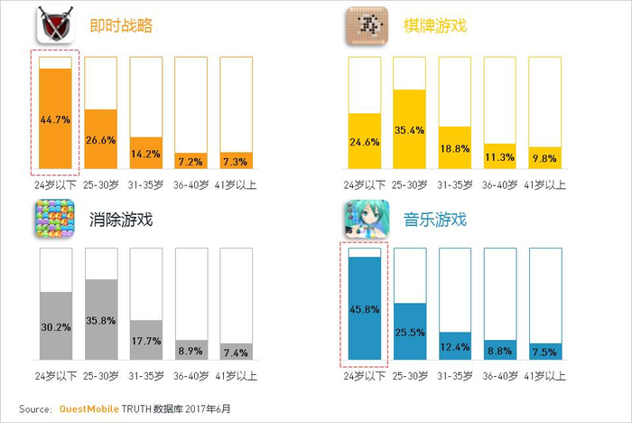 以四个热门游戏类别为例,不同游戏的人群年龄分布差异非常明显:重度的即时战略和轻型的音乐游戏是青少年的心头好,25-35岁的上班族则偏好更加轻松休闲的棋牌和消除游戏,能利用上下班和午间的间隙杀杀碎片时间。
