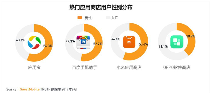 ·性别分布:大部分较为均匀,OPPO软件商店较为有特点,女性占比超60%。