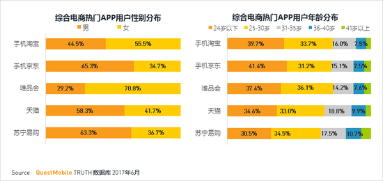 ·性别分布:京东和苏宁易购的男性占比最高,超过60%;唯品会的女性占比最高,超过70%。