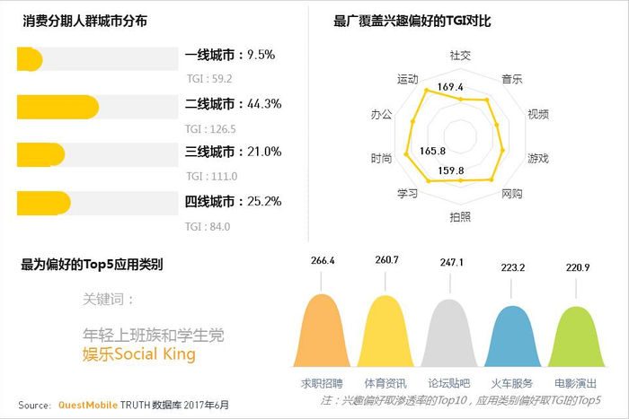 由此可见,消费分期用户是一群二三线城市的年轻上班族和学生党,他们是娱乐social king,动如脱兔。