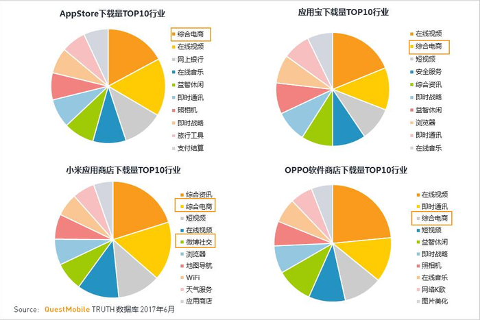 ·6月是电商大促月,所以综合电商行业在各应用商店下载都排名较前;微博社交行业在小米应用商店表现突出。