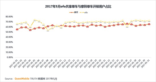 2017年5月数据来看,ofo的开锁用户占比较摩拜高约5个百分点,但摩拜的稳定性更好,波动较小。ofo的开锁用户占比平均在68%左右,最高73.7%,最低53.5%;摩拜的开锁用户占比平均在62%左右,最高66.6%,最低54% 。