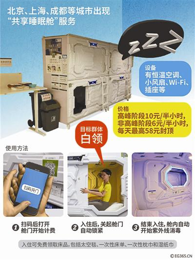 7月9日,共享睡眠舱在北京出现了。这款名为“享睡空间”的共享睡眠舱的大家伙被投放在北京中关村大厦地下二层,占地约10平方米,里面陈列了6个自助休息舱,和“共享单车”一模一样的流程,扫描、计时、付费。