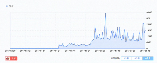 下图是抖音的微博指数,可以看出,从4月开始,就已经有用户在微博上提及抖音,而6月开始,这款软件在微博上引爆了。