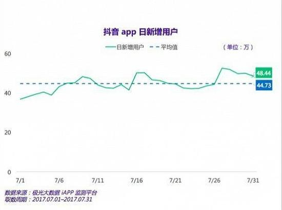 下图是极光大数据提供的抖音进入7月以来每天的日新增用户图,可以看到,7月抖音平均每天都会增长40多万用户,整个7月份,全平台的用户增长超过了1200万。