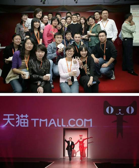下图:2012年,天猫年度盛典,淘宝商城更名天猫,张勇携手天猫女郎出场。