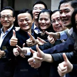 下图:2014年,阿里巴巴集团在纽交所上市,两位网店店主、快递员、消费者代表、电商服务商、网络模特、云客服、美国农场主亮相敲钟。