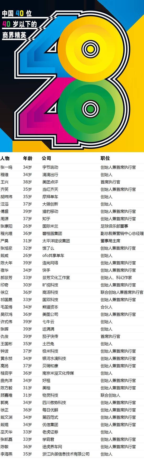 2017年中国40位40岁以下商界精英:程维胡玮炜领衔