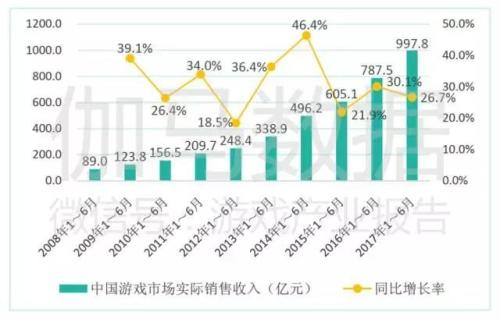 作为中国游戏领域最权威的研究机构,伽马数据的研究显示,中国游戏市场在整体上依然保持着收入的高速增长。2017年上半年,中国游戏市场实际销售收入达到997.8亿元,同比增长26.7%,210.3亿元的收入增量成为自2009年以来所有上半年收入增量中的新高。
