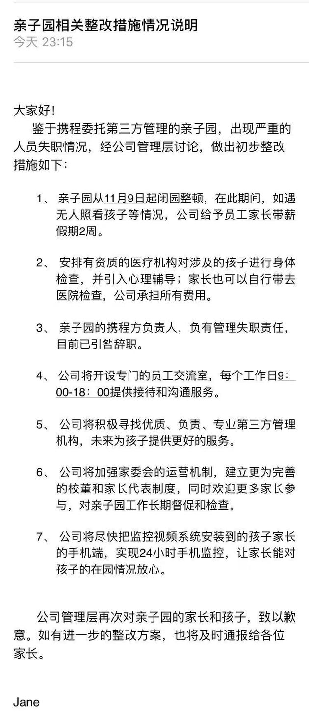 11月8日,携程发出声明,称此次事件为“个别教师的极端案例”,亲子园所有半集将停课整顿。携程已与涉事人员解除合同,会给孩子及家属进行相关的体检和心理干预,并启动相关程序重新选择亲子园的管理单位。