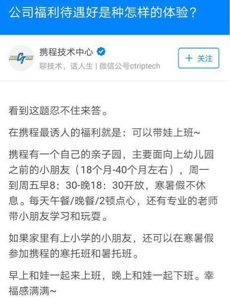 在知乎“公司福利待遇好是种怎样的体验?”这一问题下,携程官方账号曾回答“可以上班带娃”。