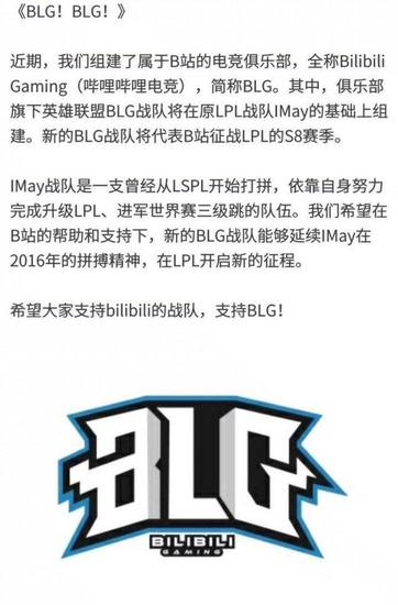 IMay战队是一支曾经从LSPL开始打拼,依靠自身努力完成升级LPL、进军世界赛三级跳的队伍。“我们希望在B站的帮助和支持下,新的BLG战队能够延续IMay在2016的拼搏精神,在LPL开启新的征程。”B站表示。