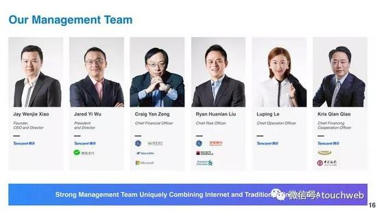 首席运营官乐露萍曾任腾讯移动互联网事业群市场部总经理,首席风控官刘华年曾任法国兴业银行风险管理高级副总裁;