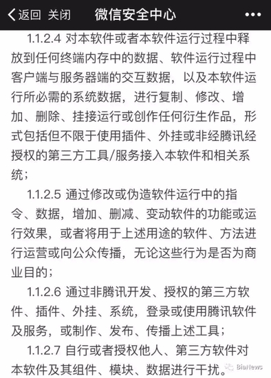 此外,微信个人账号使用规范也有关于第三方软件的说明,一经发现用户使用第三方软件或插件,腾讯有权对前述行为进行独立判断,并对相关违规账号进行处理。