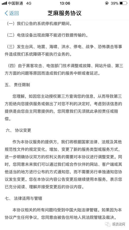 但是,如果第一次打开账单时是按照芝麻信用勾选“我同意《芝麻服务协议》”的默认操作,再次进入之后则不会显示此选项。通过查找此年账单中的其他入口,新浪【法问】并没有查到如何取消此次协议。如何终止此次服务,协议中没有体现,也没有途径。