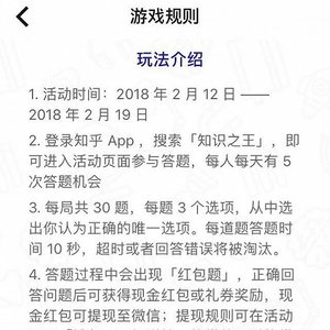 目前用户登录知乎 App,搜索“知识之王”即可参与,答题正确即可赢取最高888元红包。游戏规则如下: