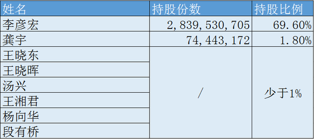 公司董事会成员与高管共持有股份2,941,052,002份,占比70.6%,具体情况如下: