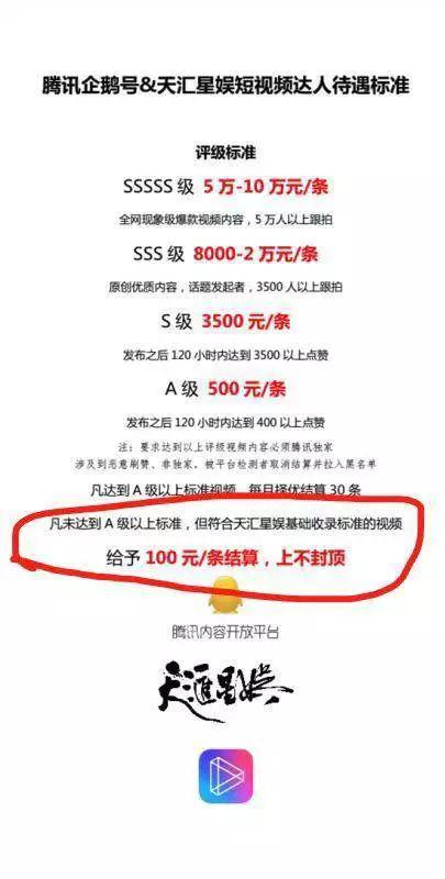 一位签约天汇的萌宠类达人告诉寻找中国创客,4月份共发布92条视频,其中3条达S级,3500元一条,另外89条保底是100块一条,共8900元,按规则合计19400元,但最终只收入100元。该达人表示,还有的达人应该收入11万,只拿到了2万。