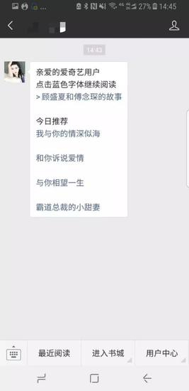 记者搜索并关注公众号以后,该公众号弹出“亲爱的爱奇艺用户,点击蓝色字体继续阅读”的消息。