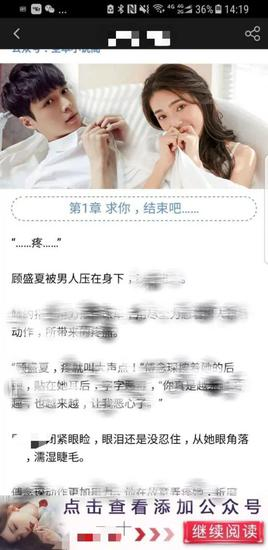 7月25日,记者打开爱奇艺App首页,往下滑时发现出现多条小说广告,点击一条写有“恶魔总裁诱妻入局”字样的广告图片后,页面显示为一部小说的第一章,名为“求你,结束吧”,小说内文含有多处低俗内容,比如“压在身下”、“用尽全力忍着”等字样。