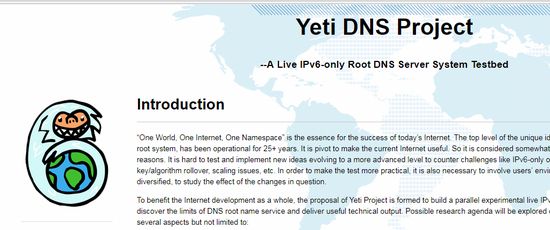 我国“互联网工程中心”联合日本WIDE机构(现国际互联网M根运营者)和互联网域名工程中心(ZDNS)等共同发起了“雪人计划”, 其官网是 www.yeti-dns.org。从这个项目的主页上,Yeti DNS Project 的标题下,可以看到一个副标题:“--A Live IPv6-only Root DNS Server System Testbed”即在线的纯IPv6 DNS根服务器系统测试床。